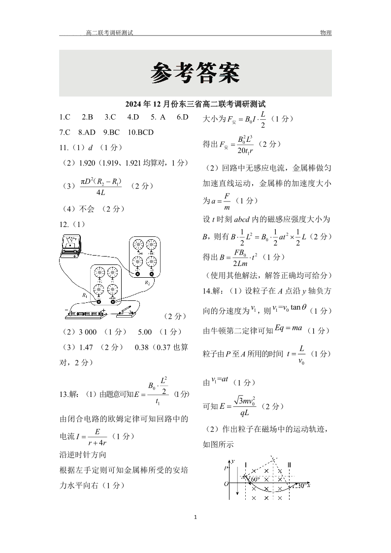 东北三省2024-2025学年高二上学期12月联考调研测试物理答案