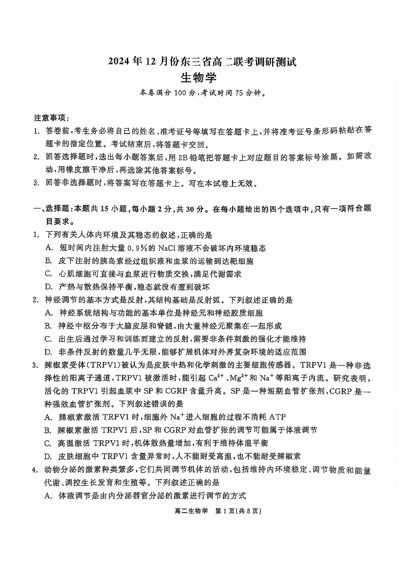 东北三省2024-2025学年高二上学期12月联考调研测试生物