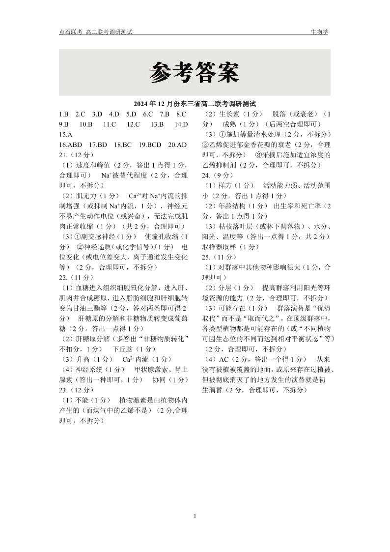 东北三省2024-2025学年高二上学期12月联考调研测试生物答案