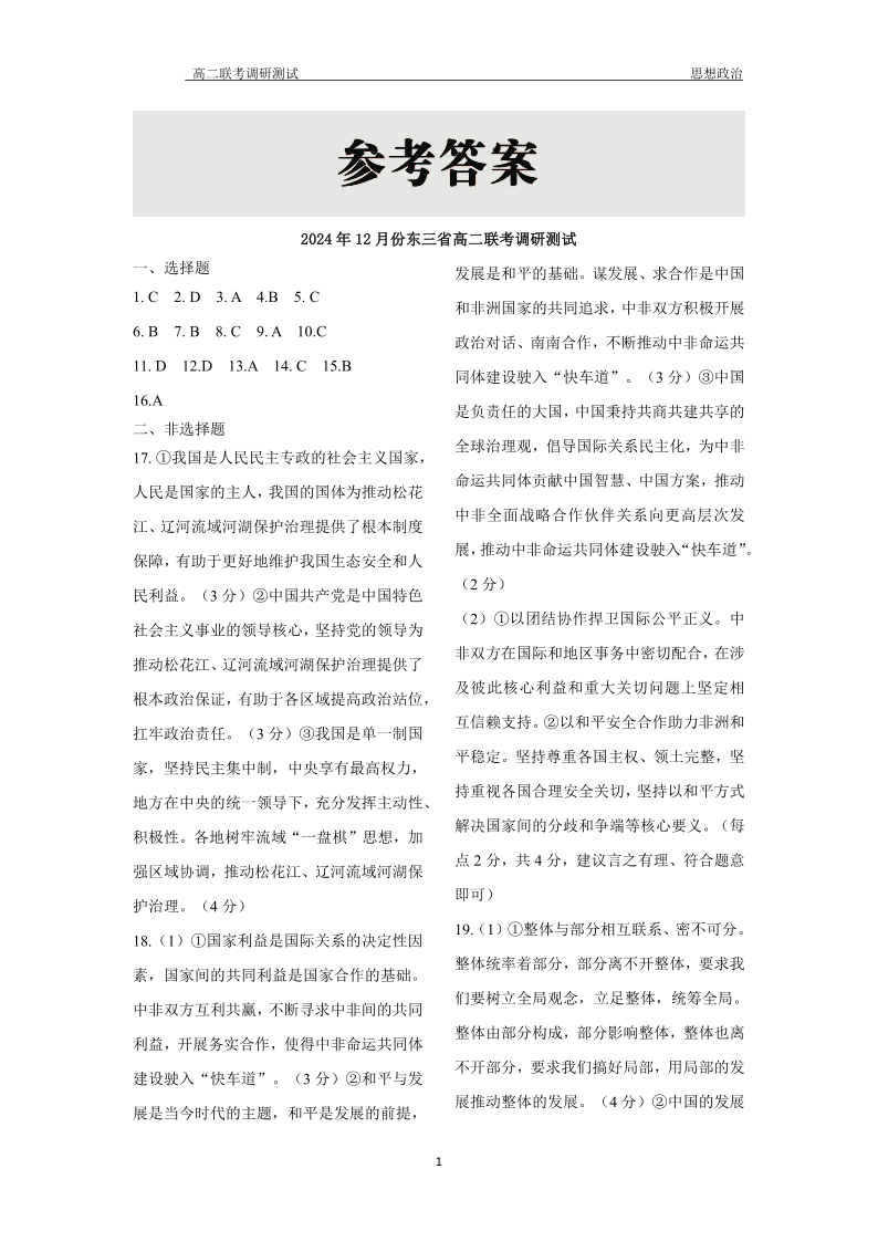东北三省2024-2025学年高二上学期12月联考调研测试政治答案