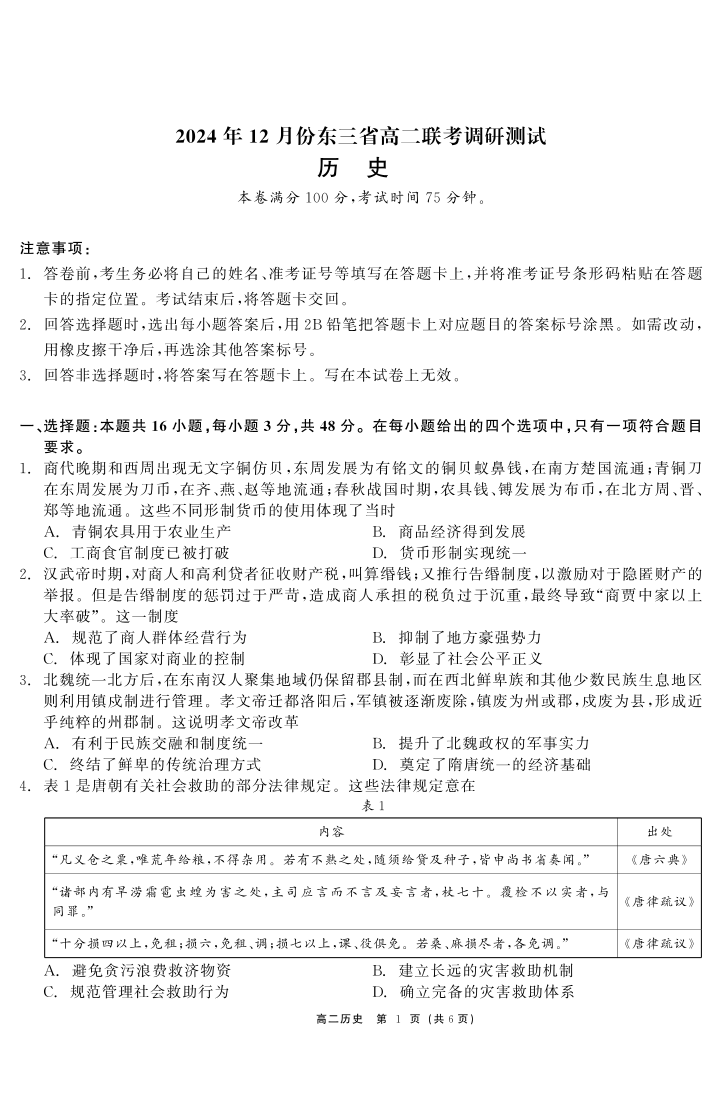 东北三省2024-2025学年高二上学期12月联考调研测试历史