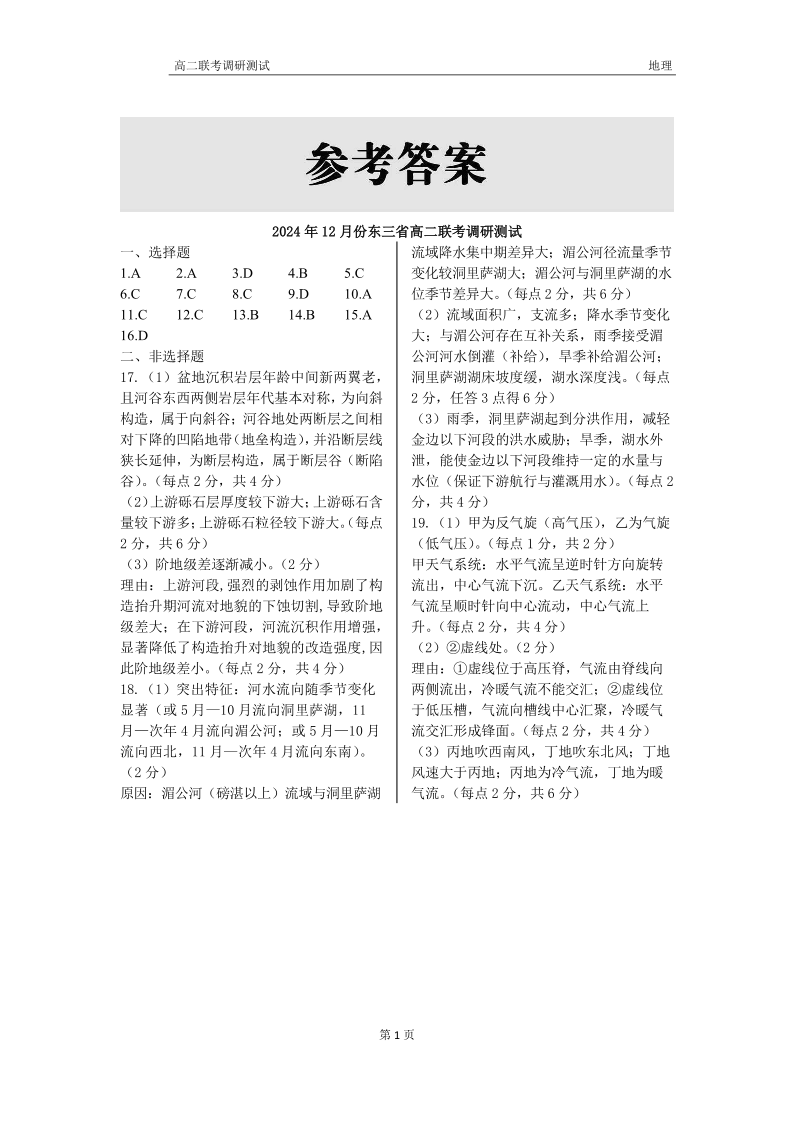 东北三省2024-2025学年高二上学期12月联考调研测试地理答案