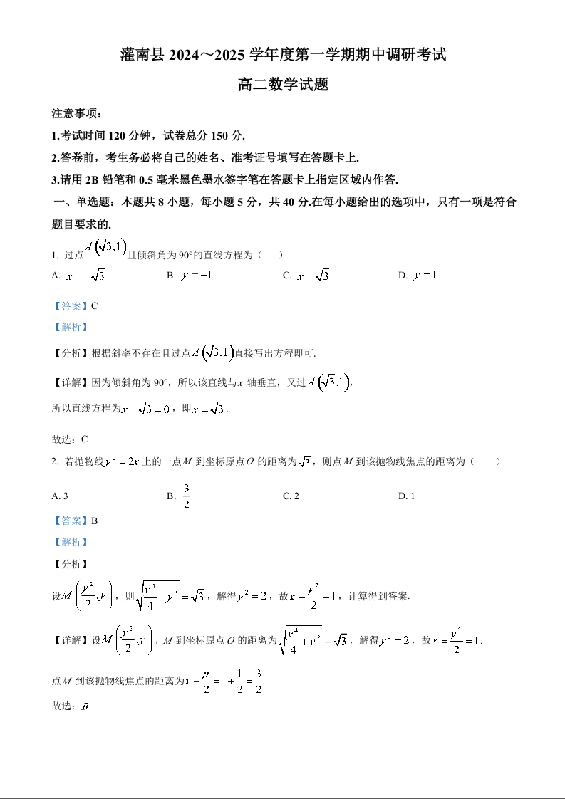 江苏省连云港市灌南县2024-2025学年第一学期高二期中调研数学(精品解析版)