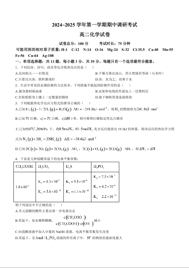 江苏省连云港市灌南县2024-2025学年第一学期高二期中调研化学含答案