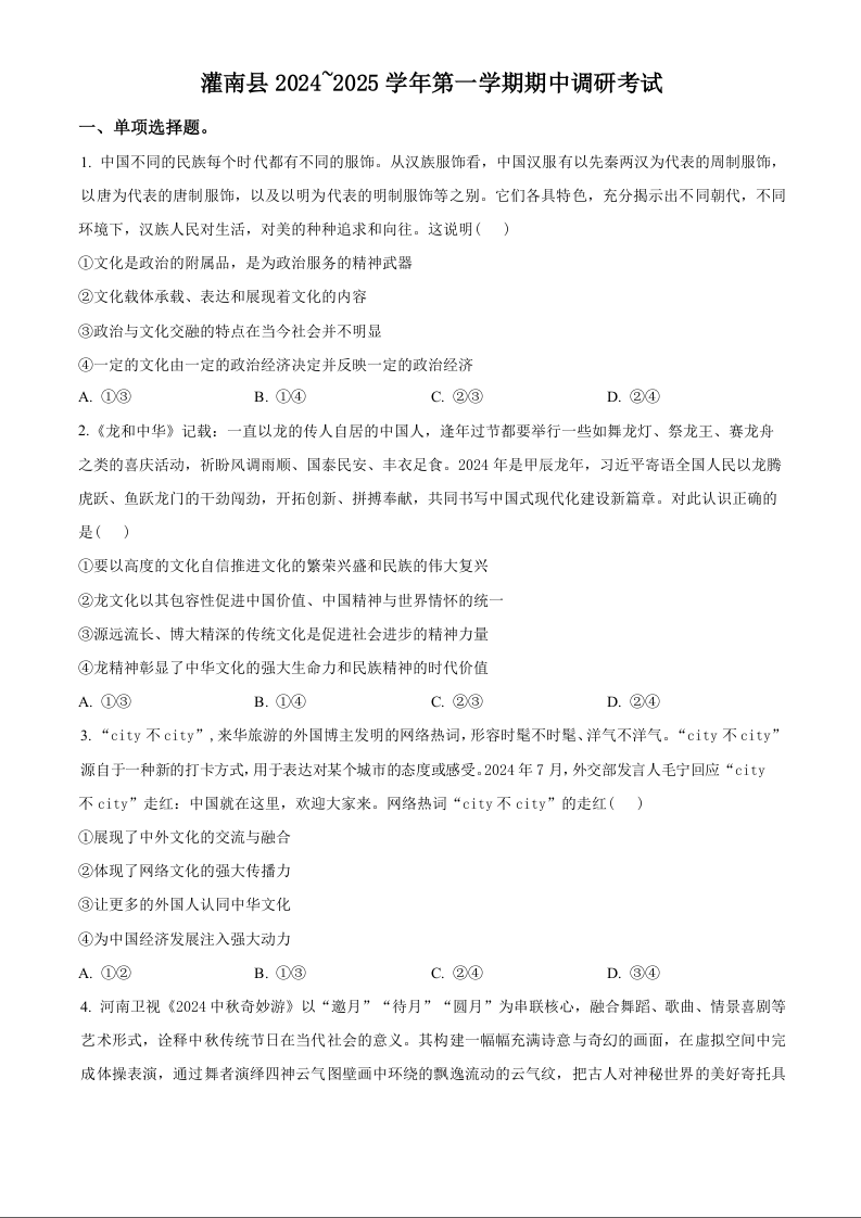 江苏省连云港市灌南县2024-2025学年第一学期高二期中调研政治(原卷版)