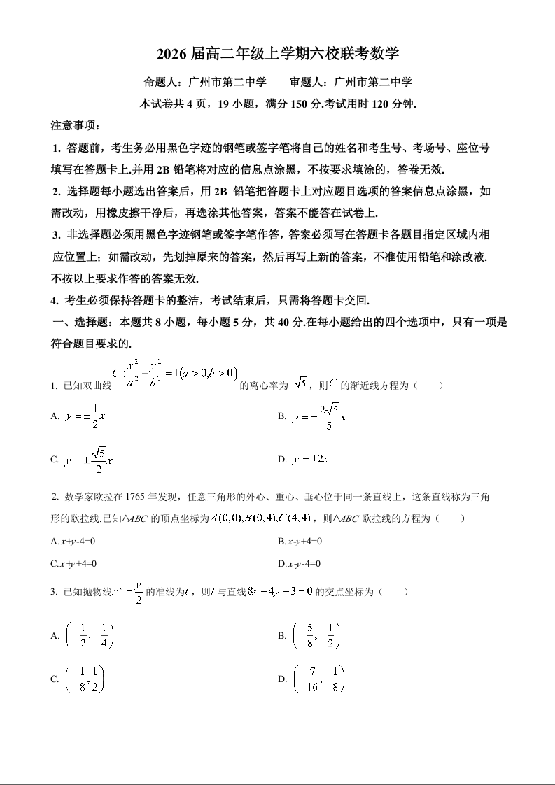广东省六校联考2024-2025学年高二上学期12月月考试题数学(原卷版)