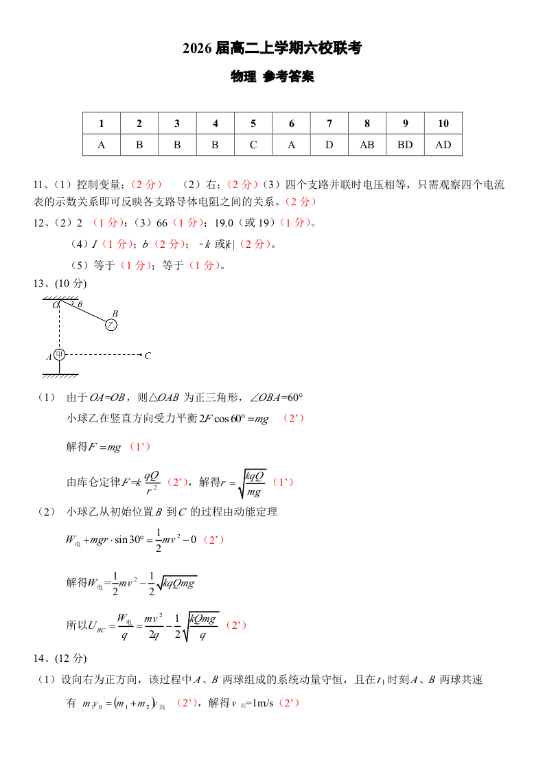 广东省六校联考2024-2025学年高二上学期12月月考试题物理答案