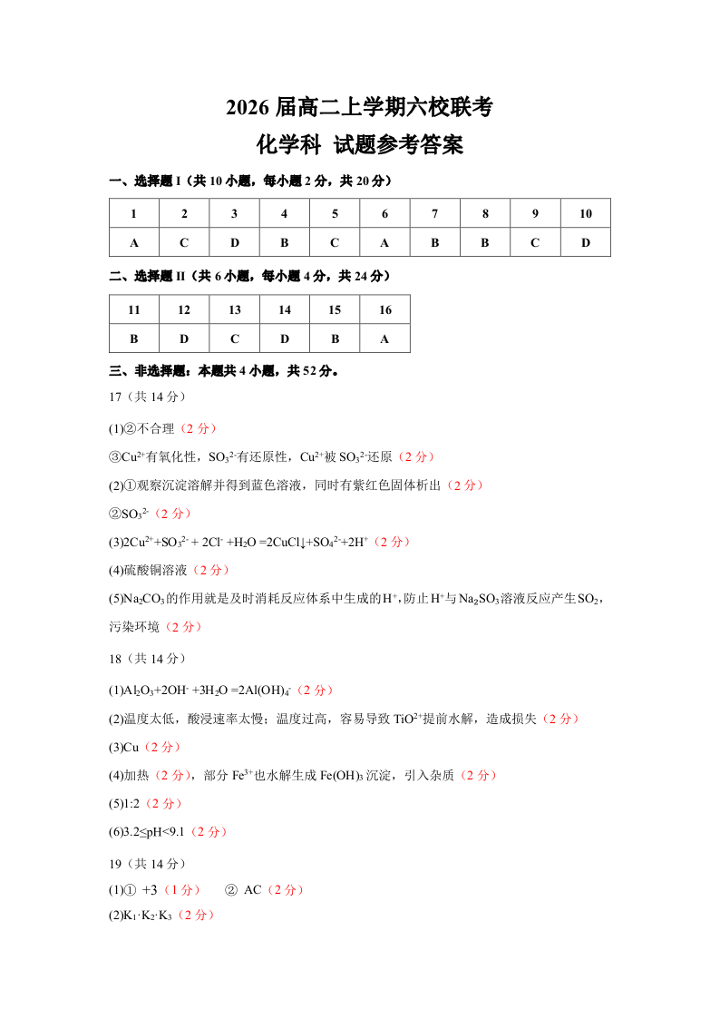 广东省六校联考2024-2025学年高二上学期12月月考试题化学答案
