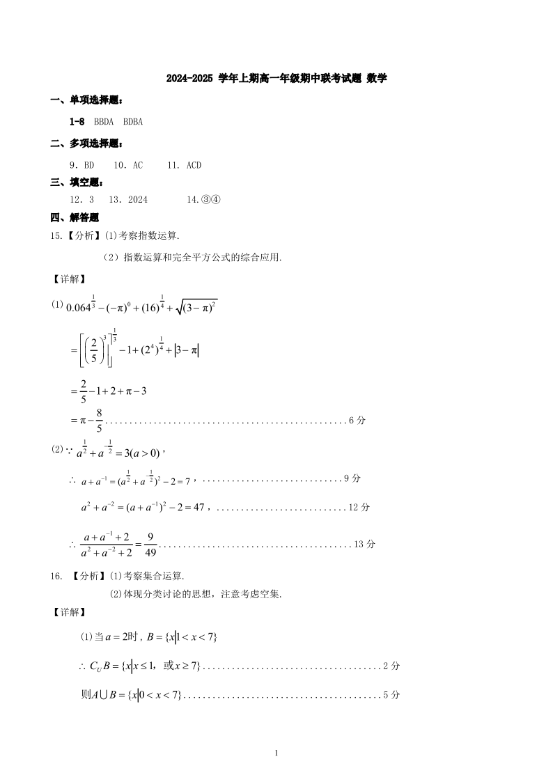 河南省郑州市十校2024-2025学年高一上学期期中联考数学答案
