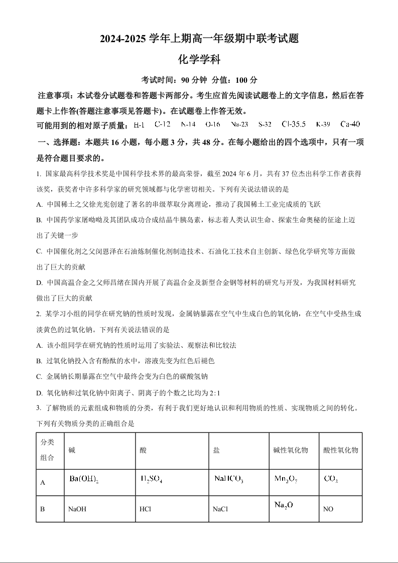 河南省郑州市十校2024-2025学年高一上学期期中联考化学(原卷版)