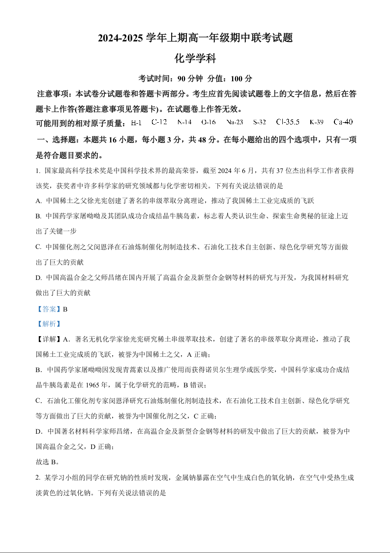 河南省郑州市十校2024-2025学年高一上学期期中联考化学(精品解析版)