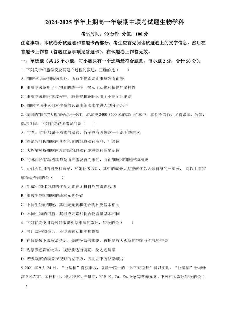 河南省郑州市十校2024-2025学年高一上学期期中联考生物(原卷版)