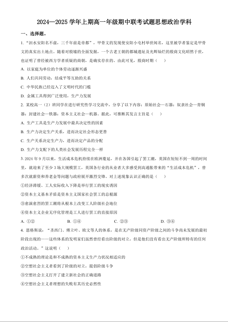 河南省郑州市十校2024-2025学年高一上学期期中联考政治(原卷版)