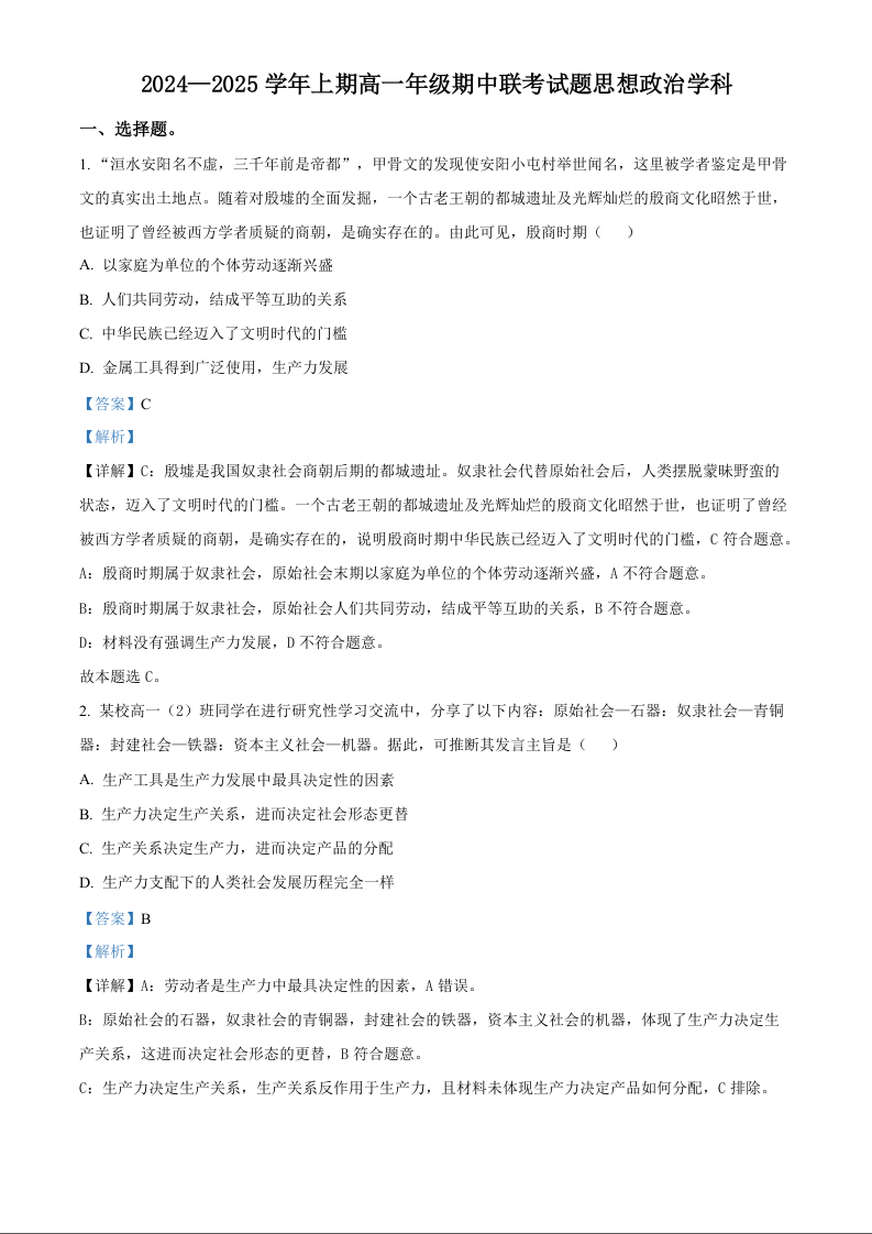 河南省郑州市十校2024-2025学年高一上学期期中联考政治(精品解析版)