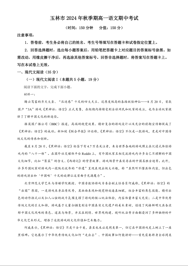 广西壮族自治区玉林市2024-2025学年上学期高一期中考调研测试语文(原卷版)