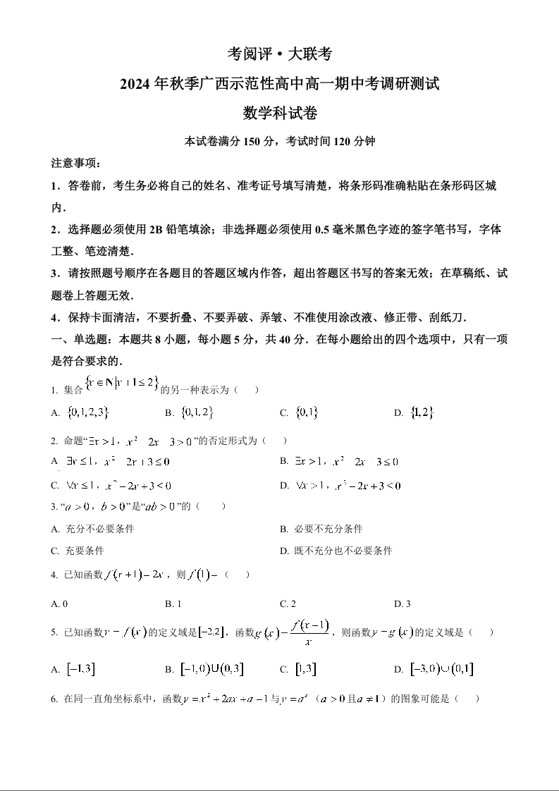 广西壮族自治区玉林市2024-2025学年上学期高一期中考调研测试数学(原卷版)