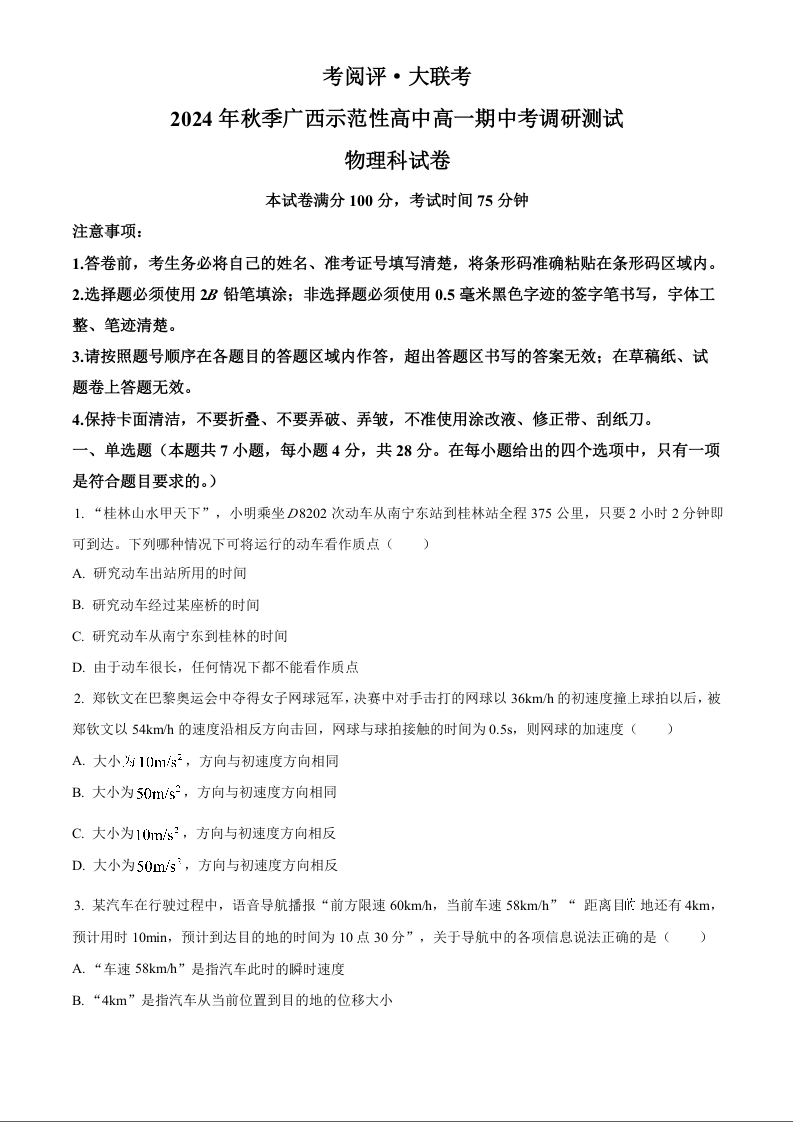 广西壮族自治区玉林市2024-2025学年上学期高一期中考调研测试物理(原卷版)