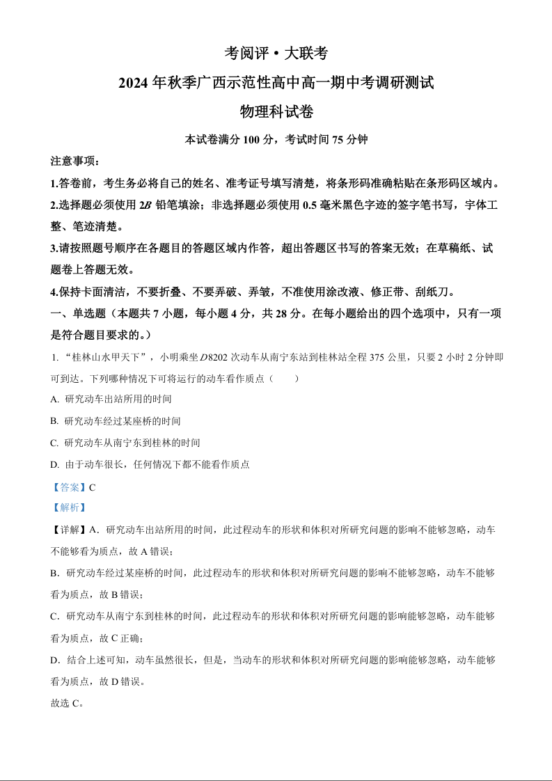 广西壮族自治区玉林市2024-2025学年上学期高一期中考调研测试物理(精品解析版)