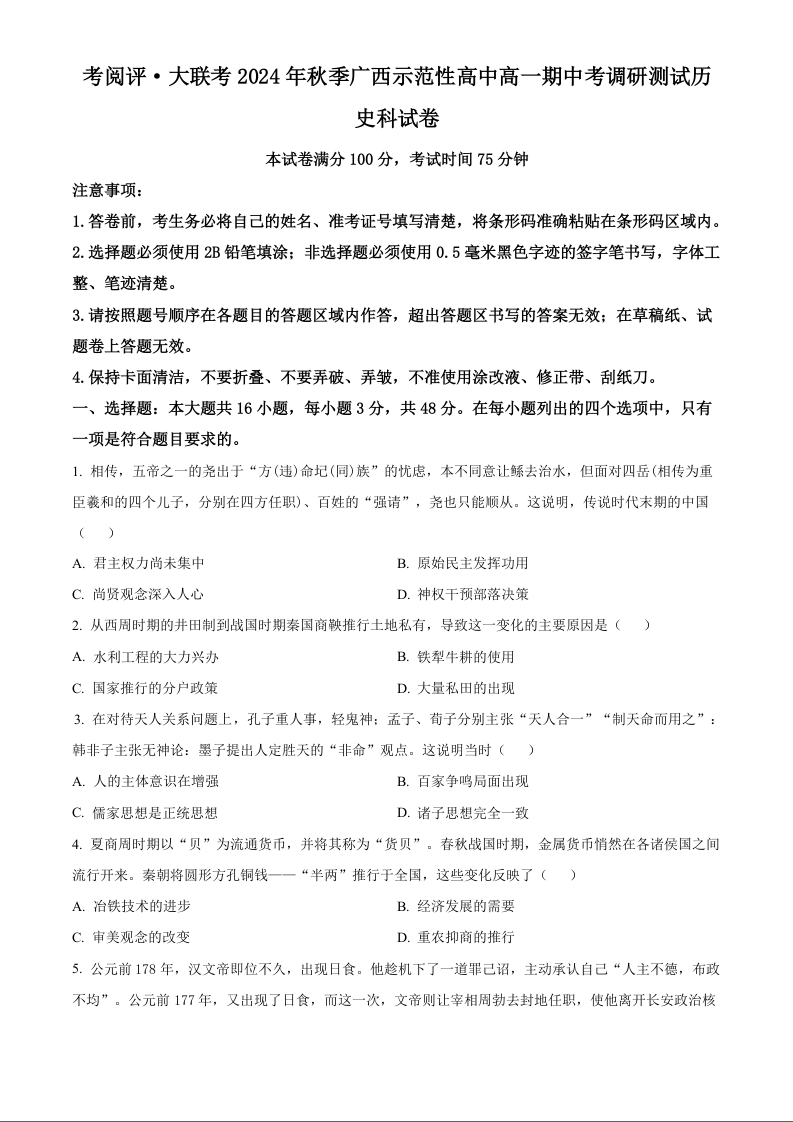 广西壮族自治区玉林市2024-2025学年上学期高一期中考调研测试历史(原卷版)
