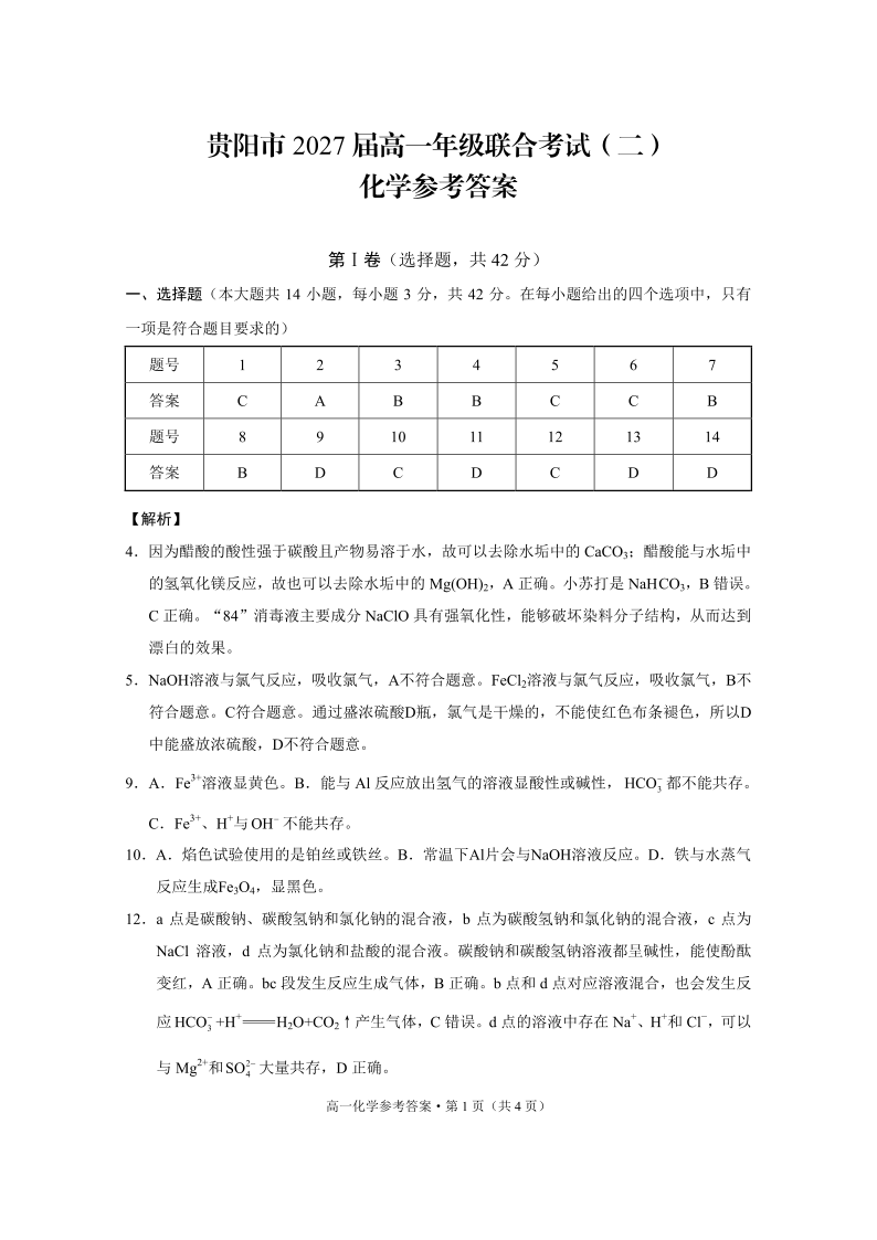 贵州省贵阳市2024-2025学年高一上学期12月联考试题化学答案
