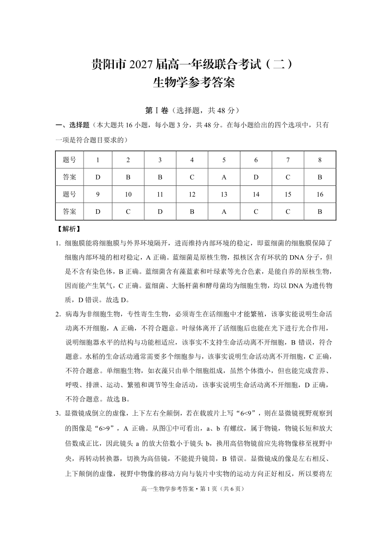 贵州省贵阳市2024-2025学年高一上学期12月联考试题生物答案