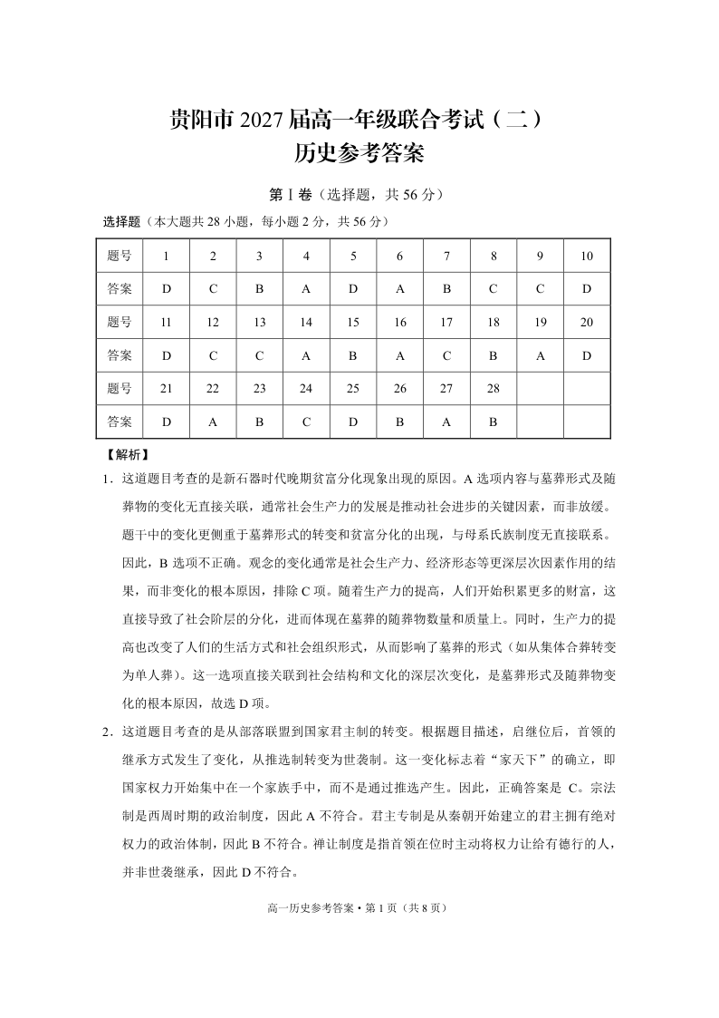 贵州省贵阳市2024-2025学年高一上学期12月联考试题历史答案