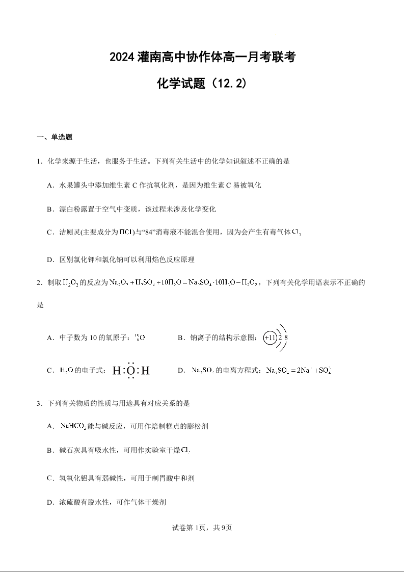 江苏省连云港市灌南高中协作体2024-2025学年高一上学期12月联考化学