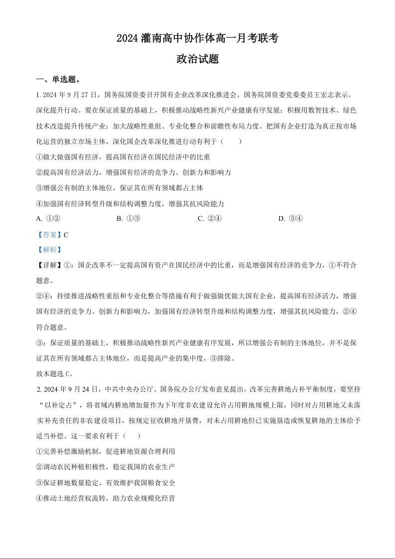 江苏省连云港市灌南高中协作体2024-2025学年高一上学期12月联考政治(精品解析版)