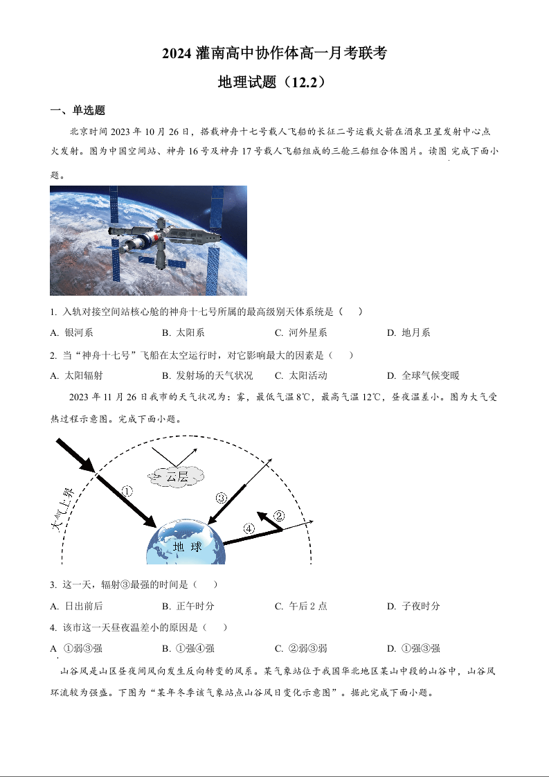 江苏省连云港市灌南高中协作体2024-2025学年高一上学期12月联考地理(原卷版)