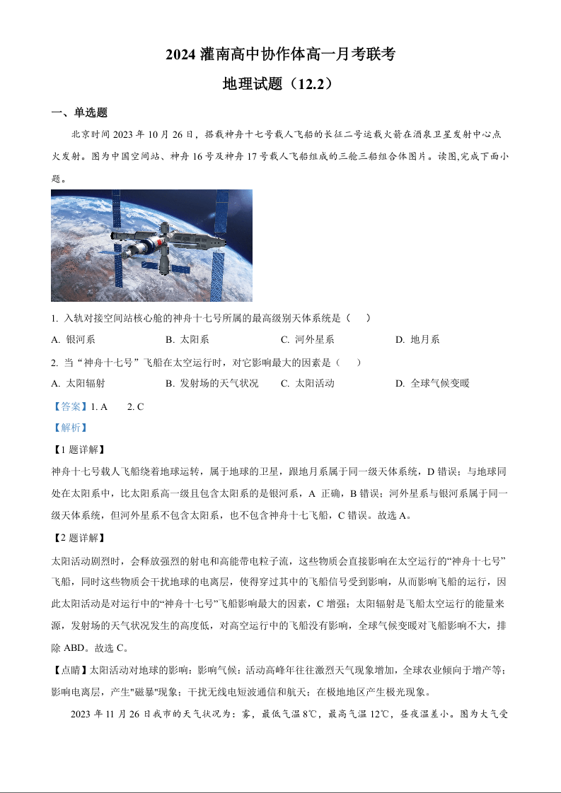 江苏省连云港市灌南高中协作体2024-2025学年高一上学期12月联考地理(精品解析版)