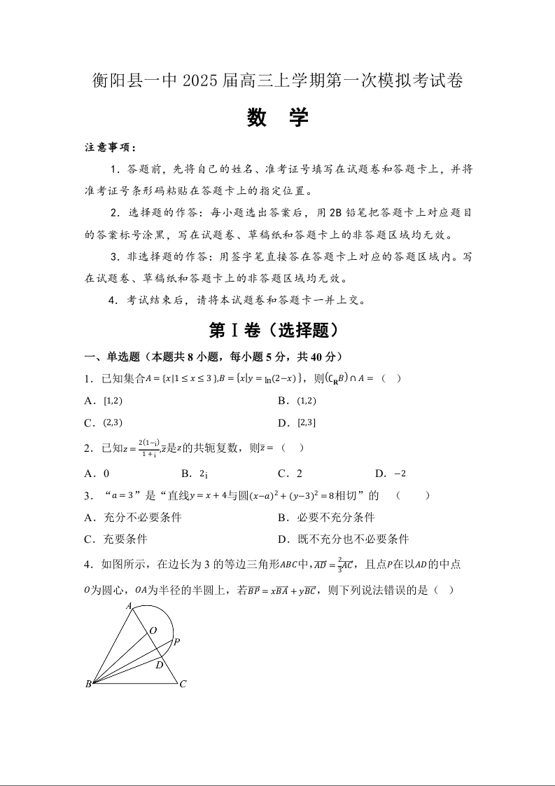 湖南省衡阳市衡阳县一中2025届高三上学期第一次模拟数学Word稿含答案