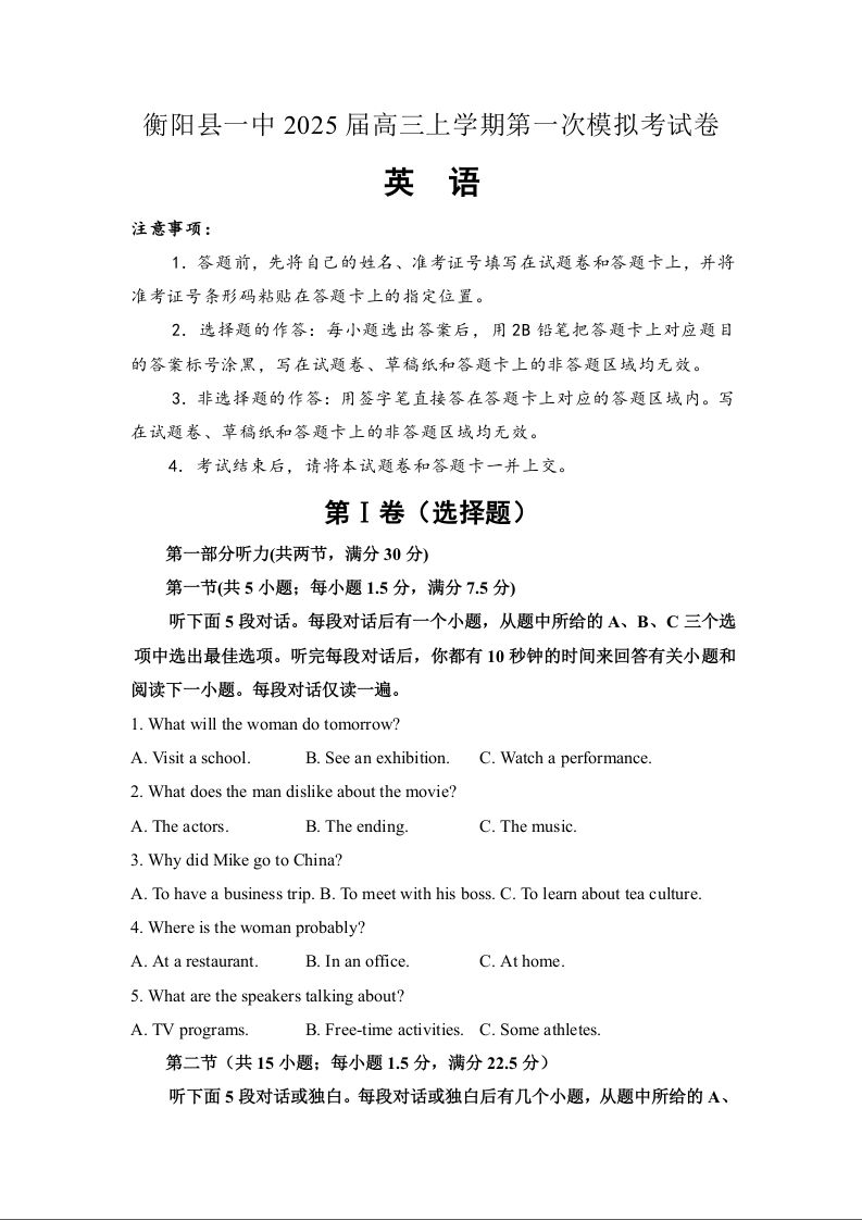 湖南省衡阳市衡阳县一中2025届高三上学期第一次模拟英语Word稿含答案