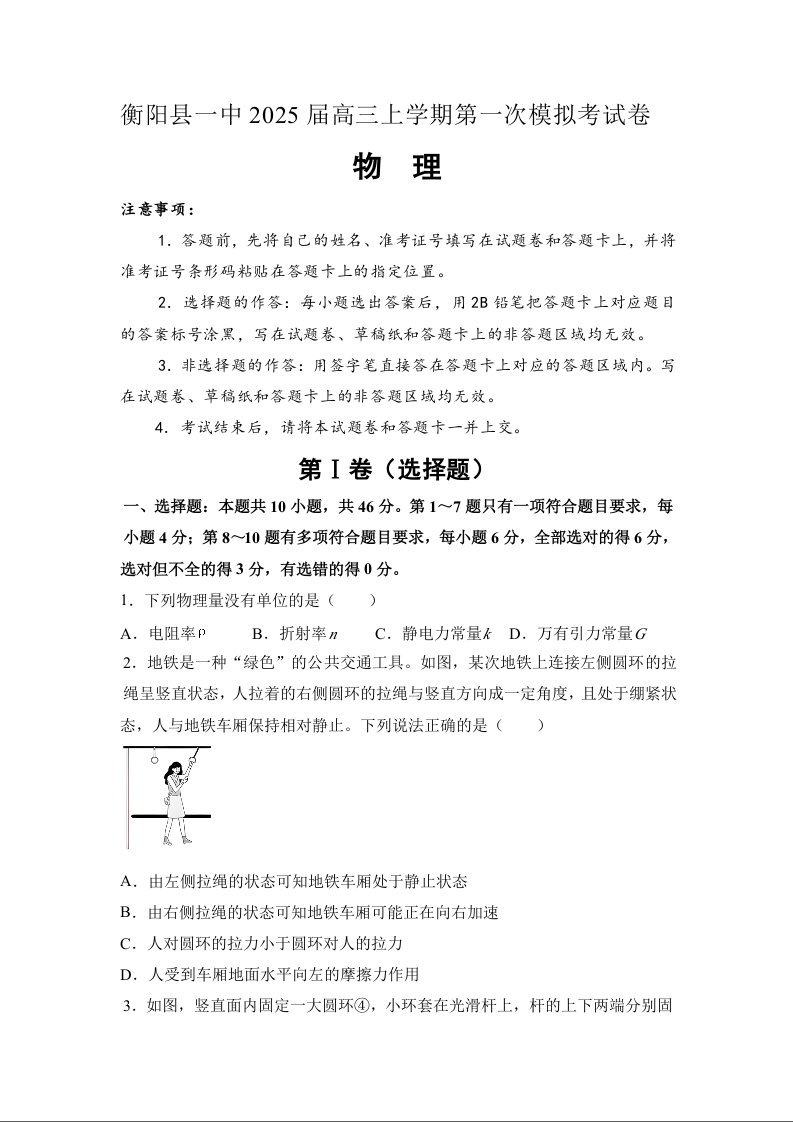 湖南省衡阳市衡阳县一中2025届高三上学期第一次模拟物理Word稿含答案