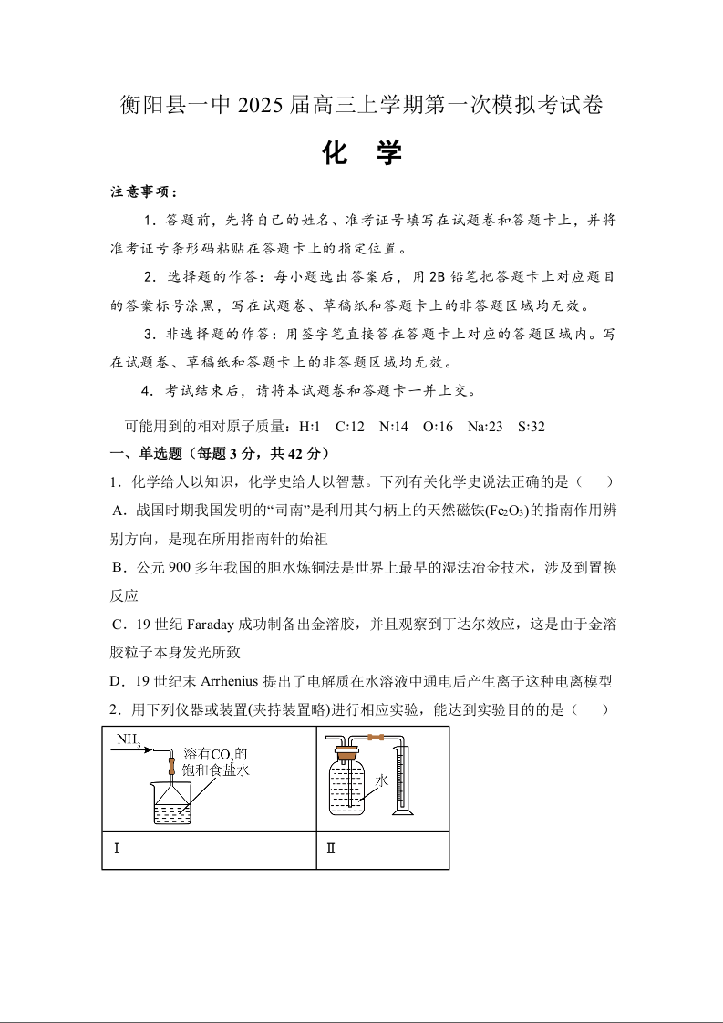 湖南省衡阳市衡阳县一中2025届高三上学期第一次模拟化学Word稿含答案