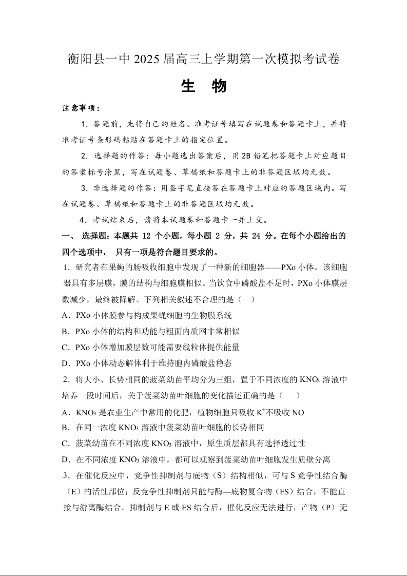 湖南省衡阳市衡阳县一中2025届高三上学期第一次模拟生物Word稿含答案