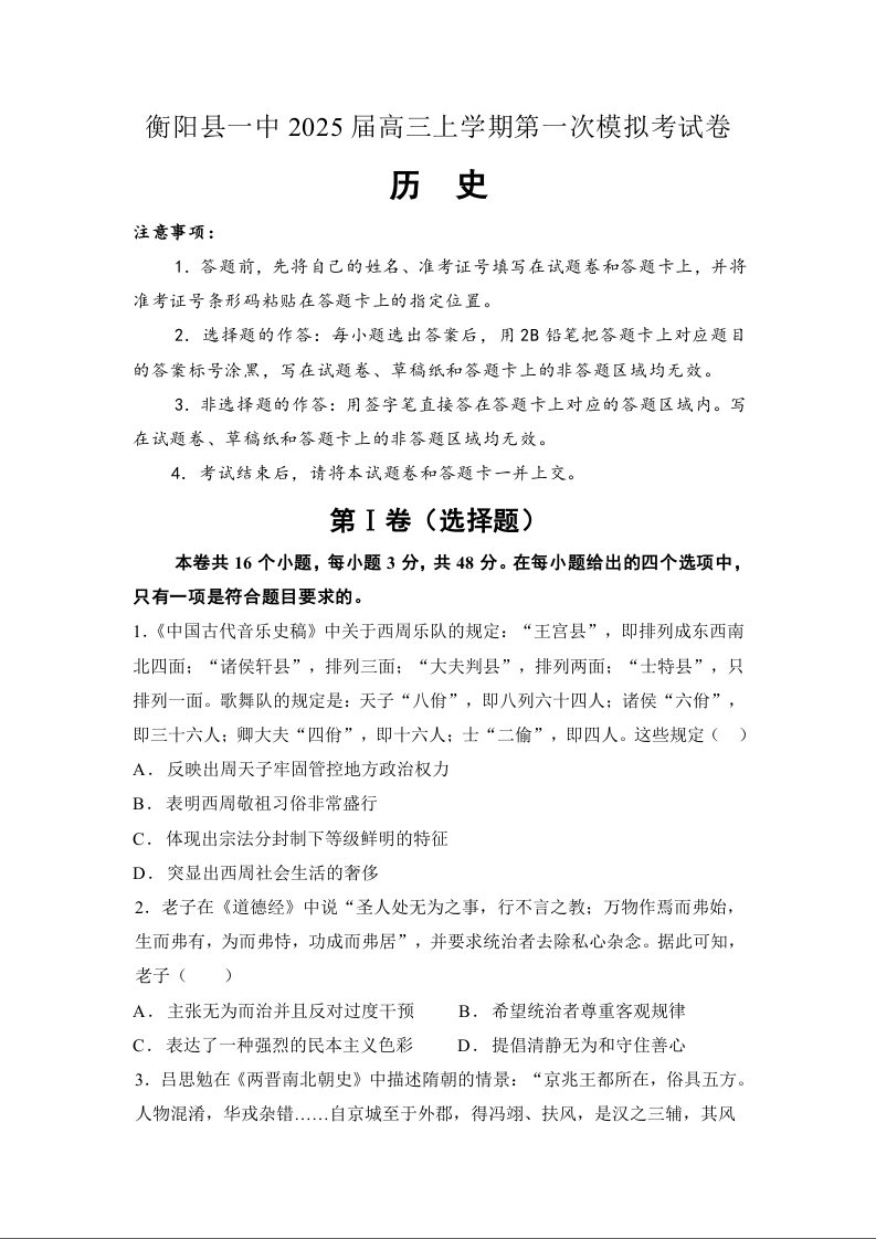 湖南省衡阳市衡阳县一中2025届高三上学期第一次模拟历史Word稿含答案
