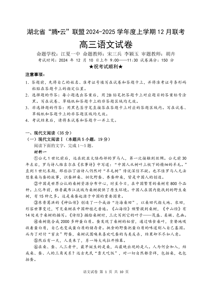 湖北省腾云联盟2025届高三上学期12月联考语文