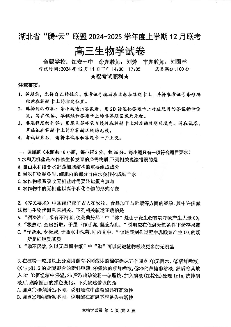 湖北省腾云联盟2025届高三上学期12月联考生物