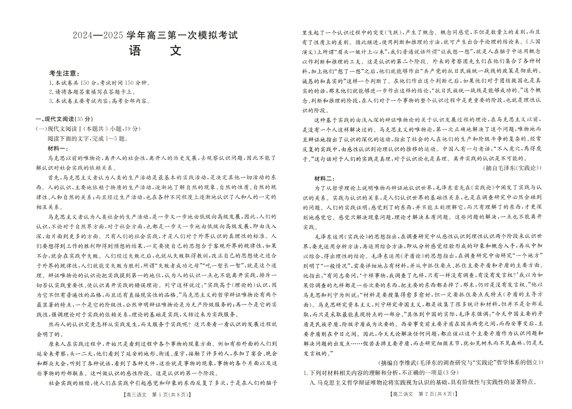 河南省新乡市2025届高三上学期第一次模拟考试语文