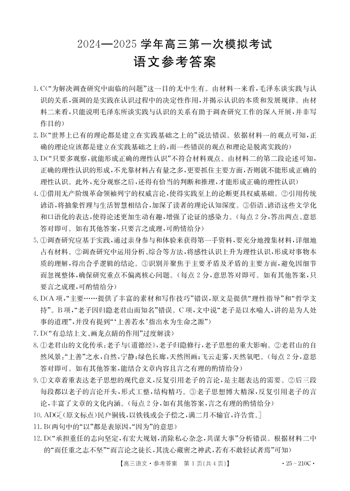 河南省新乡市2025届高三上学期第一次模拟考试语文答案