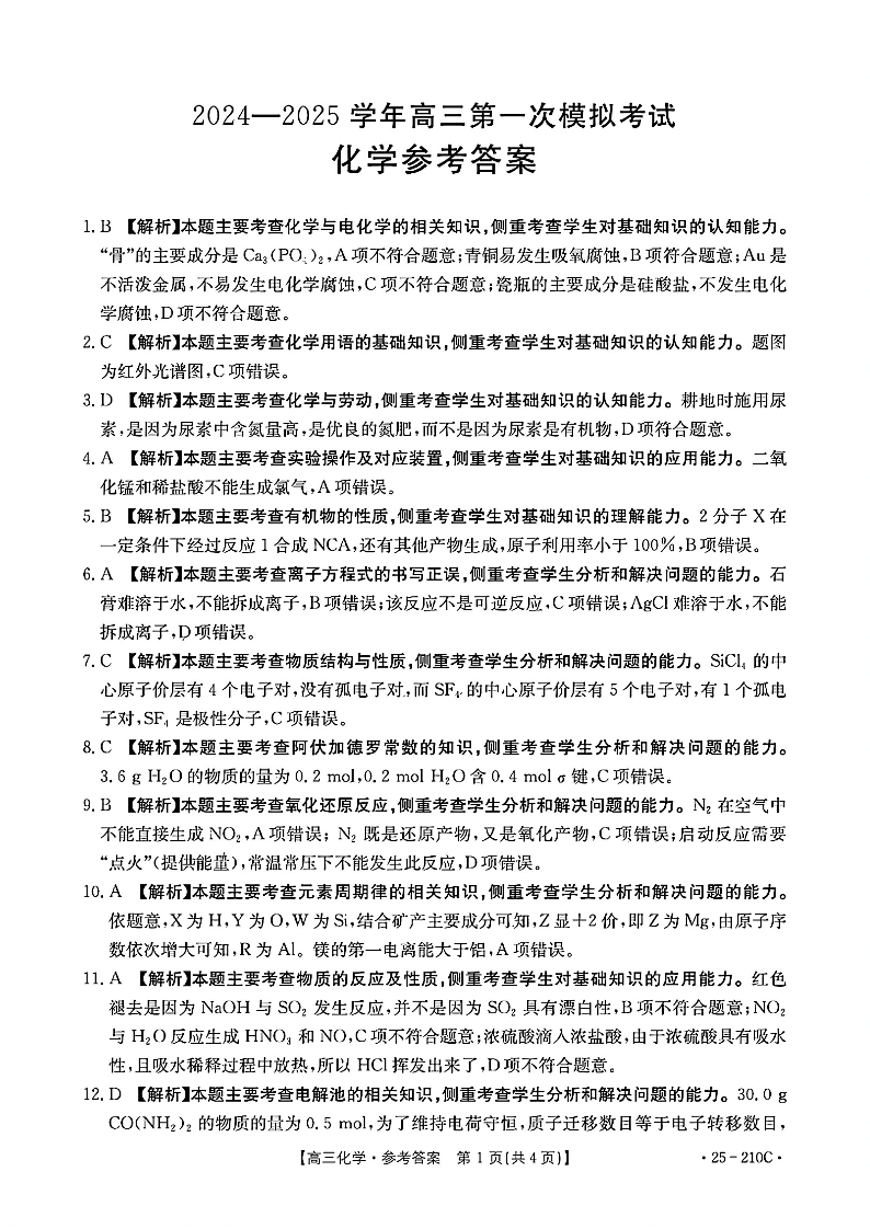 河南省新乡市2025届高三上学期第一次模拟考试化学答案