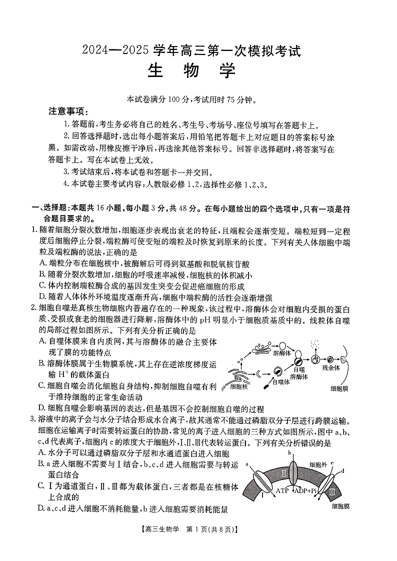 河南省新乡市2025届高三上学期第一次模拟考试生物PDF稿含答案