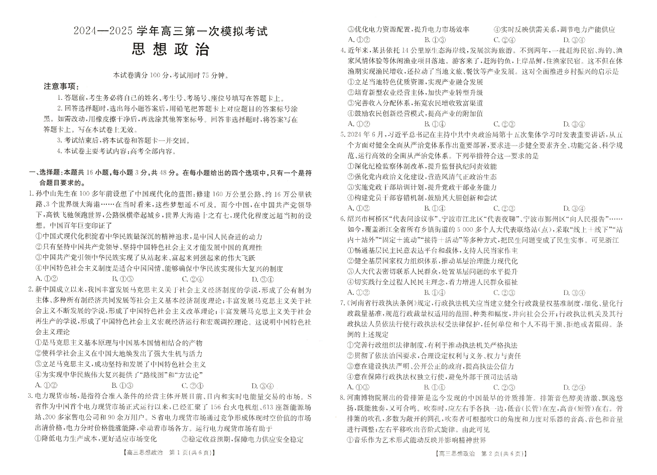 河南省新乡市2025届高三上学期第一次模拟考试政治