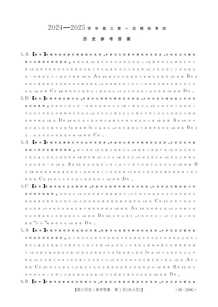 河南省新乡市2025届高三上学期第一次模拟考试历史答案