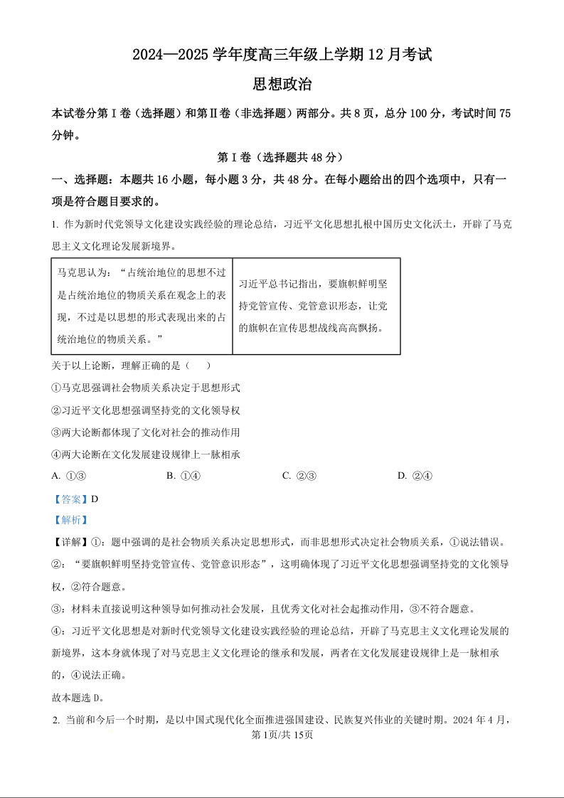 河北省衡水市冀州中学2025届高三上学期12月月考政治(精品解析版)