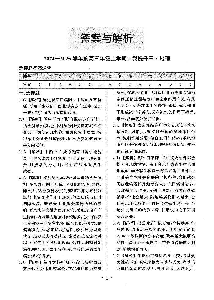 河北省衡水市冀州中学2025届高三上学期12月月考地理答案
