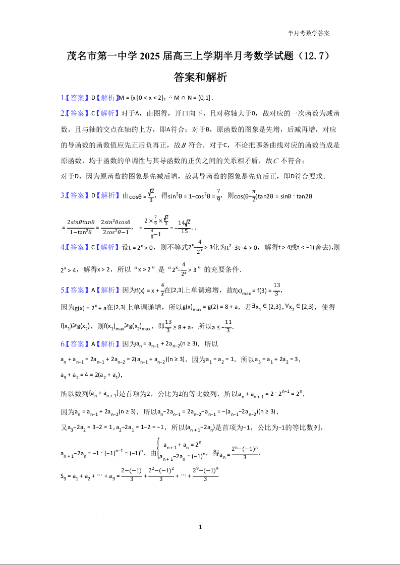 广东省茂名市第一中学2024-2025学年高三上学期半月考数学答案