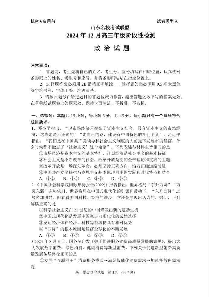 山东省济南市名校考试联盟2024.12高三年级阶段性检测政治