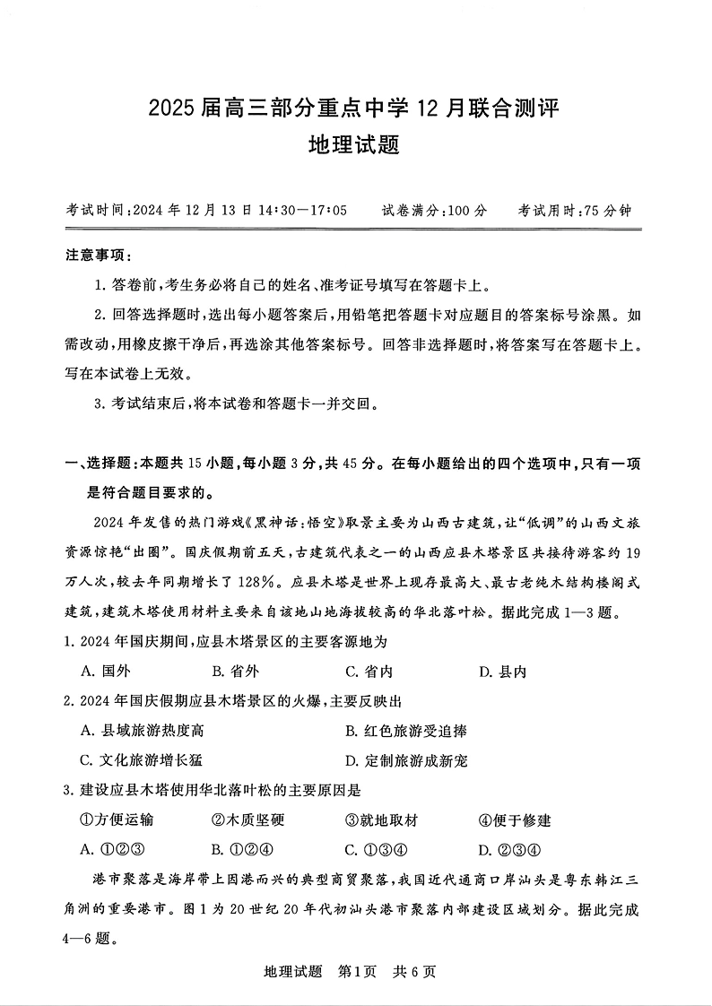 T8八省八校联考2025届高三部分重点中学12月联合测评地理PDF含答案