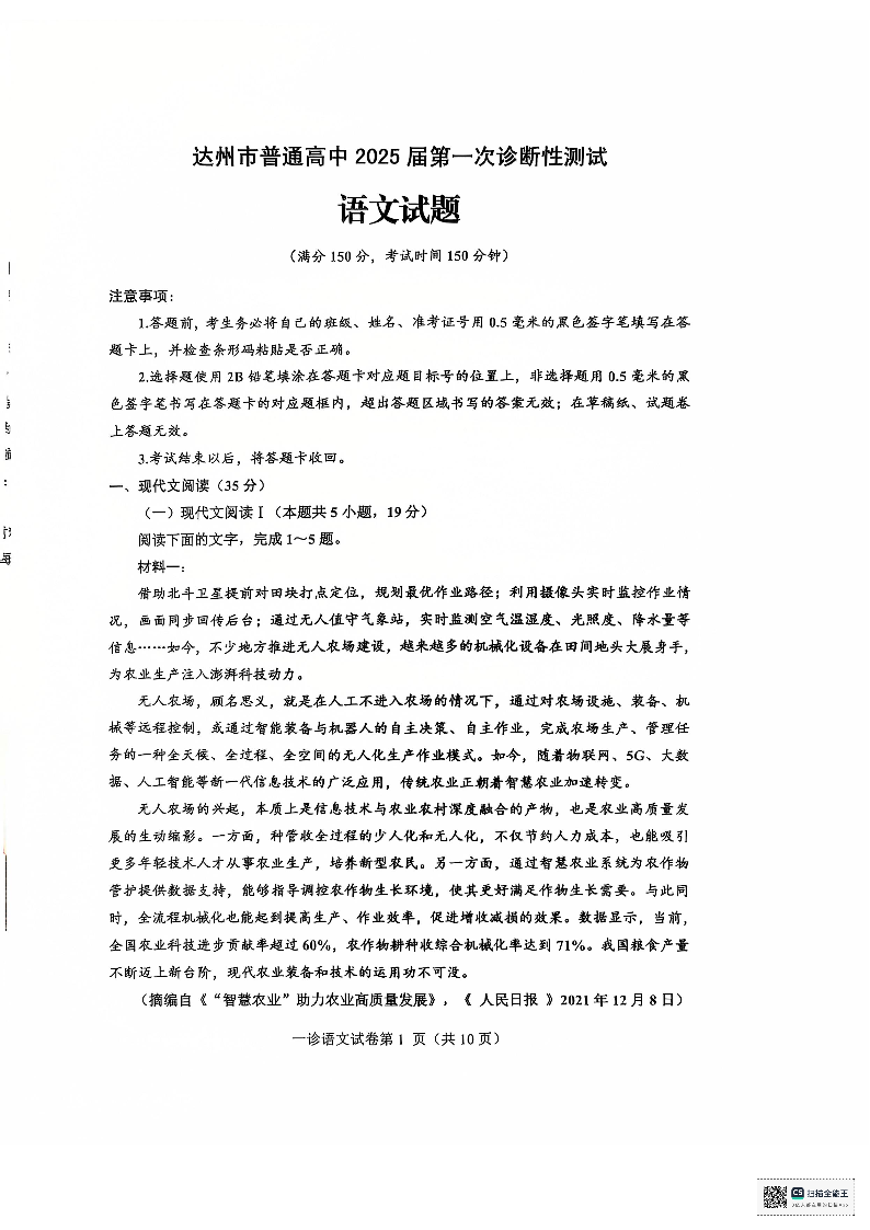 四川省达州市普通高中 2025 届第一次诊断性测试语文
